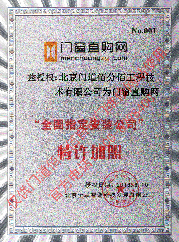 門窗直購(gòu)網(wǎng)授權(quán)門道佰分佰為指定安裝公司證書